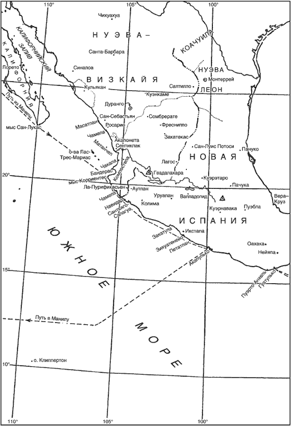 Начинаясь с провинции Теуантепек, территория, подвластная вице-королю Новой Испании, пролегала на запад и север вплоть до Калифорнии и выходила за ее пределы. Вице-король, имеющий королевский двор в Мехико, был ответствен в военном смысле за огромный регион, простирающийся от Вест-Индии до Филиппинских островов. Он также был президентом аудиенции Мексики, под юрисдикцию которой попадал и полуостров Юкатан. А в Гвадалахаре существовала отдельная, независимая аудиенция со своей судебной и даже политической властью. Под ее контролем, в свою очередь, находились королевства Нуэва-Галисия, Нуэва-Визкайя, а также земли к северу от побережья залива Навидад. Обе части Калифорнии подчинялись непосредственно вице-королю Новой Испании. Органы местного самоуправления немногочисленных испанских поселений, расположенных вдоль побережья, были вверены алькальд-мэрам. На самом деле алькальд-мэры были наделены обширными полномочиями и обладали властью большей, чем обычные мэры, фактически это были губернаторы зачастую довольно обширных территорий. Прибрежными территориальными единицами и делениями в Новой Испании, находившимися в подчинении алькальд-мэров, были Теуантепек, Гуатулько, Акапулько, Закатула, Колима и Аутлан. А в числе подобных делений аудиенции Гвадалахары были Ла-Пурификасьен, Компостела, Сан-Себастьян и Кульякан.