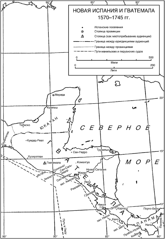 Начинаясь у мыса Бурика, юрисдикция аудиенции Гватемалы распространялась к северу и на запад, вплоть до Теуантепека. В то время как формально власть на этой территории принадлежала вице-королю Новой Испании, фактически регион был независим от него. Капитан-генерал, живущий в Сантьяго-де-Гватемала (ныне Антигуа), также был президентом аудиенции и подчинялся непосредственно королю. В его подчинении было множество провинций с нечетко обозначенными границами, где власть принадлежала губернаторам и алькальд-мэрам – местным должностным лицам, наделенным королем полномочиями, приблизительно соответствующим английским мэрам города, но зачастую сфера полномочий которых распространялась на гораздо большую территорию. На западном побережье, с юга на север, этими провинциями были Коста-Рика, Никоя, Никарагуа, Сан-Мигель, Сан-Сальвадор, Сонсонате, Гватемала и Соконуско.