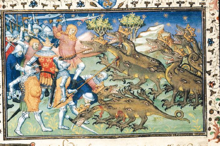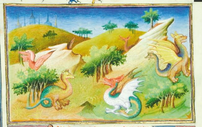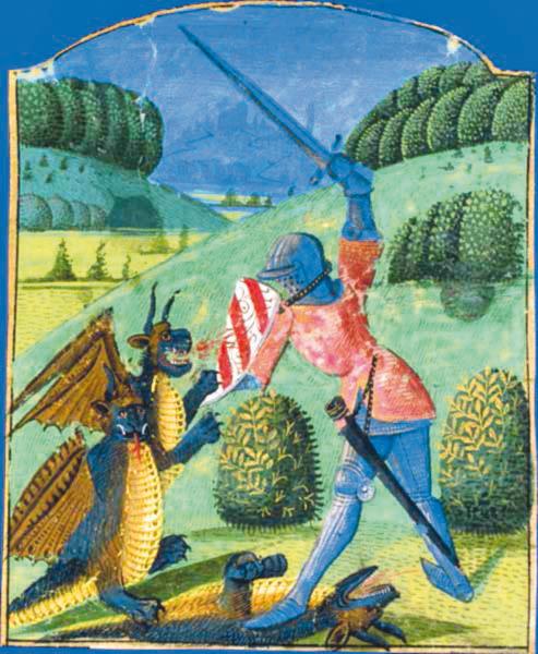 Победы над драконами прославили не только христианских святых. Знаменитые средневековые рыцари Персеваль и Ланселот тоже вступали в схватку с ними. Приключения короля Артура и его славных рыцарей нередко иллюстрировались миниатюрами с этими эпическими сражениями. Но, пожалуй, самым известным укротителем драконов был великий завоеватель Александр Македонский, ставший легендарной фигурой для всего западноевропейского рыцарства. На миниатюрах из сборника о приключениях Александра, созданных в первой четверти XV века, можно увидеть, как он одерживает победу над драконами с бараньими рогами, двуглавыми драконами, изумрудоголовыми драконами и другими удивительными представителями этого семейства.