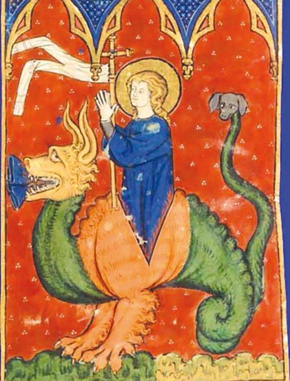 Дракон часто появляется в сюжетах, связанных с историями из жизни христианских святых: победа Святого Георгия над Змием, победа Святого Михаила над драконом, история Маргариты Антиохийской, которая смогла выбраться из чрева проглотившего ее дракона благодаря кресту, и другие похожие предания. Во всех этих примерах дракон выступает в своей самой очевидной роли – воплощает дьявола, поверженного святыми с помощью веры во Христа. Эпизоды, связанные с укрощением и даже приручением драконов, стали своего рода общим местом в житиях христианских святых: так, на миниатюре из Большого часослова Анны Бретонской священнослужитель из Орлеана Святой Лифард изображен с драконом, которого он держит на цепи, словно собственного питомца. Практически ту же самую картину можно наблюдать и на миниатюрах с изображением Святой Марфы: праведница выгуливает на поводке драконоподобное чудище по имени Тараск, которого она смогла покорить своим чудесным пением.