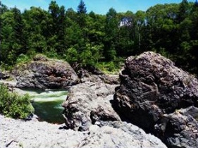 От Дальнегорска до водопада Чёрный Шаман (Амгинский) 361 км. По времени это составляет 3,5 часа до Тернея (160 км), затем – от 3,5 часов по грунтовой, малолюдной дороге до места ночёвки на поляне лесной дороги к спуску в ущелье (201 км). Заправить автомобиль в Пластуне или Тернее не всегда возможно, поэтому надо брать с собой 20 л топлива в запас. На первой развилке дороги после Тернея не надо поворачивать на Таёжное, едем прямо. Потом следует крутой подъём на перевал, где стоит указатель «Амгу – Кема». Поворачиваем на Амгу. Для того, чтобы автомобиль не перегрелся на крутом и затяжном подъёме перед этой развилкой, стоит включить обогрев салона с вентилятором, открыть окна. Нас это не один раз спасало. Потом проезжаете первый мост после спуска с перевала и через три километра увидите прижим реки Амгу к дороге, где её обрамляют огромные валуны серого цвета: