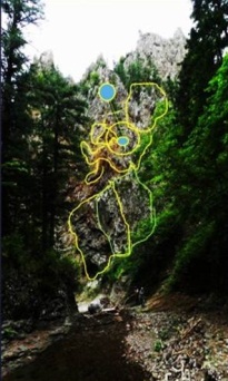 Очертания рыбы включают в себя ковш Пегаса, на каменной копии которого внутри ковша есть окружность. Запомните этот круг, он снова встретится на скалах ущелья, подтверждая информацию, которую я сняла с камня. Перед вами не плоская карта звёздного неба, а объёмная, которая очень пригодится будущим космонавтам, путешествующим в космическом пространстве. Недавно учёные открыли полевой пузырь вокруг Солнечной системы, это её тело. Видимо, такие же тонкие тела, которые способен почувствовать космический аппарат в виде сопротивления скорости полёта, есть и у других звёздных систем. Каменные изваяния наших создателей дают нам представления об этом.
