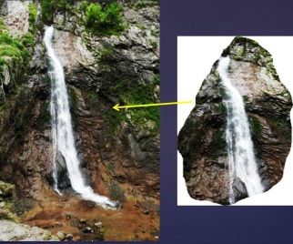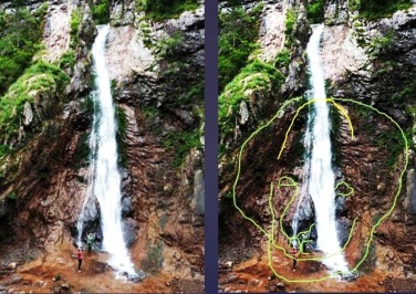 В самом низу водопада стоит чёрный камень, похожий на шамана в чёрном одеянии, но я увидела ещё мужское лицо с бородой и в шапке старо-русского манера. Высоту водопада оценивают в 33 метра. Оценить это можно по нашим фигурам под его потоком. Здесь я выделяю морду льва внизу водопада с отлично выполненными линиями гривы: