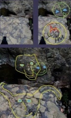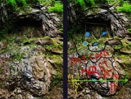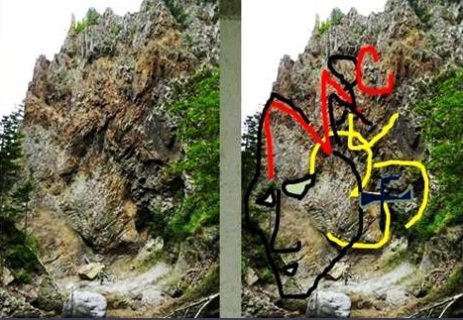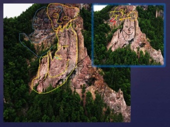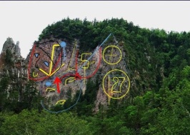 На центральном месте – скала в виде торса бородатого мужчины со сложенными в замок ладонями перед ним. Выше выбиты буквы и морды медведей, руна силы, стрелка от круга – орбиты звезды. Ниже выбито лицо лысого человека. На скалах увидела число 13545, которое может означать расстояние до созвездия, слова «трон ари, Мари» на фоне морды медведя (созвездия Медведицы). В смеси всего выделяю двойной портрет с выбитым числом 5457 и словом «трон» на головном уборе, звездой с отходящими лучами на месте у левого глаза и со стрелой во лбу: