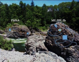 Обратите внимание на длинную прямую линию – стрелу, идущую от квадрата на каменной рыбе к камню с медведем. Она повторится на скалах в ущелье Чёрного Шамана, и я разгадаю, что она означает, это вы прочитаете далее. На теле медведя видим квадрат, линию, отходящую от него к кружку. Ничего не напоминает? Это же созвездие Малой Медведицы! Значит, на камнях представлена звёздная информация. Я прочитала её так: «Акаша. Макоша. Кама (эпоха, река в России) див (дэвов). Зри Лив (льва) сол (солнце). Бир (медведь)». Акаша с санскрита переводится как тонкая, сверхчувственная духовная сущность, наполняющая все пространство; изначальная субстанция, отождествленная с Эфиром. Буквально это слово означает небо, но в своём мистическом смысле оно означает невидимое небо. Фактически, она является Всемирным Пространством, в котором неотъемлемо заключена вечная Мыслеоснова Вселенной в ее вечно изменяющихся аспектах на планах материи и объективности, из которого излучается Первый Логос или выраженная мысль. Акаша имеет лишь один характерный признак – звук, ибо звук есть переведенный символ Логоса – Речи в ее мистическом смысле. В этом месте звук издаёт текущая среди скал речная вода. В жертвенных мистериях Акаша есть всеуправляющий и всемогущий Дэва, управляющий магическими эффектами религиозного действия. Случайно ли, Дэвы и Акаша упоминаются и на скале? С санскрита слово «дэв» переводится как «светящийся», это духи Природы (Википедия). Содержание Вед показывает, что индусы пять тысяч лет тому назад приписывали Акаше те же свойства, какие тибетские ламы приписывают ей сейчас. Они рассматривали её как источник жизни, как резервуар всех энергий, как движущую силу всех изменений в материи. В своем латентном состоянии она в точности совпадает с нашим понятием всемирного эфира; в своем активном состоянии она становится Акашей, всенаправляющим и всемогущим богом (https://ru.teopedia.org). Макошь – богиня славян, ткущая судьбы людей, рыба – символ, связанный с соответствующим созвездием и с Христом. Он называл своих учеников «ловцами человеков», а Царствие Небесное уподоблял «неводу, закинутому в море и захватившего рыб всякого рода» (Википедия). Если посмотрим на рельеф России в районе реки Кама, то увидим морды рыбы, медведя и льва, таких, как изображены на скалах: