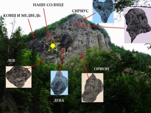 Наше Солнце находится в созвездии Льва и Девы в августе, сентябре. Сириус с Орионом находятся в это время на противоположной стороне звёздного глобуса, который очень условен. А скальная карта является объёмным отображением такого положения главных для землян и Богов звёзд. Кроме этого, на скале изображён крупный медведь с лицом спящего человека внутри и румяная голова молодого человека с выбитой на нём стоящей боком птицей: