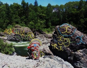 В области рта выбито «Шира» (Сириус), слова «Мама, Мари» и много ещё чего. Скалы в ущелье стоят, как частокол, не зря ущелье называют «Пасть дракона»: