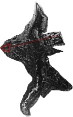 У него нечеловеческие крупные, миндалевидные глаза. Поперёк его изображения на рельефе выбит шагающий сармат, проткнутый стрелой или летящей звездой и рыбой: