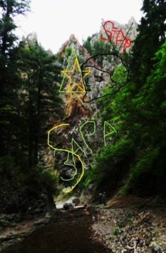 Высоту скал отражают идущие вдоль ручья наши туристы. Они возвышаются на 220 метров, не меньше. Посмотрите внимательно на скалы: из камня вылита огромная латинская буква S, рядом Т, А, Р. Вместе это слово читаю как «Стар», как английское «звезда». Тут же нахожу слова «Сара», «Зара» (свет), выше выбит на скале треугольник со звездой и кругом внутри и голова человека: