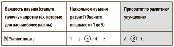 Я считаю, что этот навык критически важен для меня. Я думаю, что он развит у меня хорошо. Приоритет в его развитии для меня – в категории В. Строка таблицы у меня будет выглядеть так: