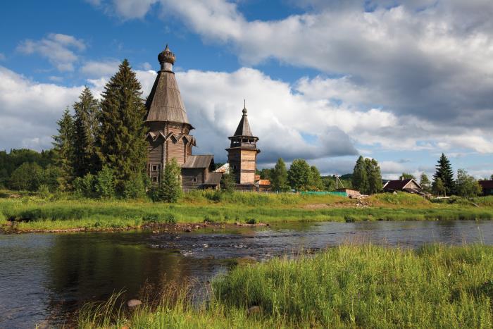 На самом въезде встречает стройная фигура Георгиевской церкви, своими ярусами уходя ввысь, с небольшой главкой в центре. Самая старая церковь России, стоящая на своем исконном месте. Это определение можно встретить во всех источниках и книгах по деревянному зодчеству, во всех справочниках, статьях в журналах и интернете. Это своеобразная «визитная карточка» храма и деревни в целом. В самом деле, есть у нас в стране еще более древние церкви и часовни, но все они ныне находятся в музеях деревянного зодчества. Из общей троицы самых старых деревянных церквей лишь одна Георгиевская церковь стоит там, где была срублена в 1493 (по другим источникам, 1496) году, и с небольшими изменениями и переделками сохранилась до наших дней. Две другие – церковь Ризоположения из села Бородава (1485 год), находится в Кирилло-Белозерском монастыре; и церковь Воскресения Лазаря из Муромского монастыря (около 1391 года), стоящая ныне в Кижах.