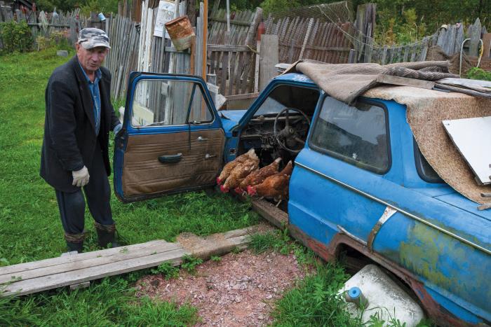 После этого всякий раз, когда оказываюсь в Согиницах в теплое время года, стараюсь зайти к Юрию Викторовичу. Тут у него и старый дом, и баня по-черному, и куры в старом «Запорожце».