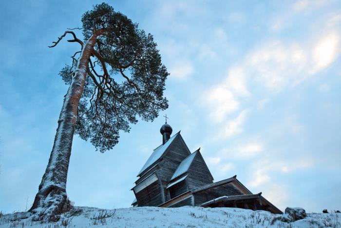 Интересно то, что с разных точек церковь и смотрится совсем по-другому. Если стоять со стороны алтарного прируба, то кажется, что она выполнена в виде высокого сооружения с одним объемом, наподобие сгоревшей в 2018 году церкви в Кондопоге… Но, если обойти ее со стороны озера, видно, что помимо основного объема и трапезной, есть еще другой уступ двускатной клинчатой кровли. Еще один ярус представляет великолепное двухвсходное резное крыльцо. Самая же величественная картина открывается взгляду с озера, прямо с воды. Каскады двускатных крыш постепенно спускаются к обрывистому берегу. Глаз скользит по ним сверху вниз, и вся конструкция начинает оживать. Четкий ритм рубленых форм, будто музыка, звучит на фоне леса, колышется на ветру, словно дерево или пламя свечи. Финальные нотки этой деревянной партитуры принадлежат величественной сосне, в вечном поклоне склонившей свою седую крону перед шедевром рук человеческих. Причем все ветви направлены в одну сторону, и чем дальше ты отходишь в озеро, тем целостнее и гармоничнее смотрится общая картина. Поистине необыкновенно. Такая красота и гармония складываются из четких пропорций, невероятной выверенности всех деталей и элементов кровли, сруба. Увеличь маковку или барабан, расширь скаты кровли или ширину трапезной, и все – пропадет симметрия, исчезнет потрясающая гармоничность дерева. Как могли мужики пять сотен лет назад рассчитать такую сложную многоярусную конструкцию, а потом взять да сотворить это чудо? Да, видно, духом они были другим, вольным дышали воздухом.