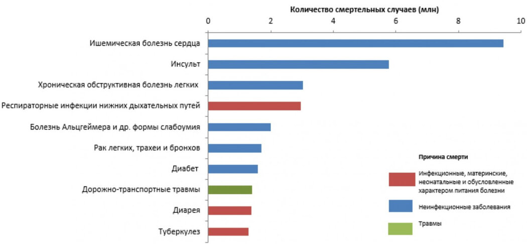 Когда говорят о причинах старения и смерти, часто приводят статистику ВОЗ, вот такой примерно рисунок1: