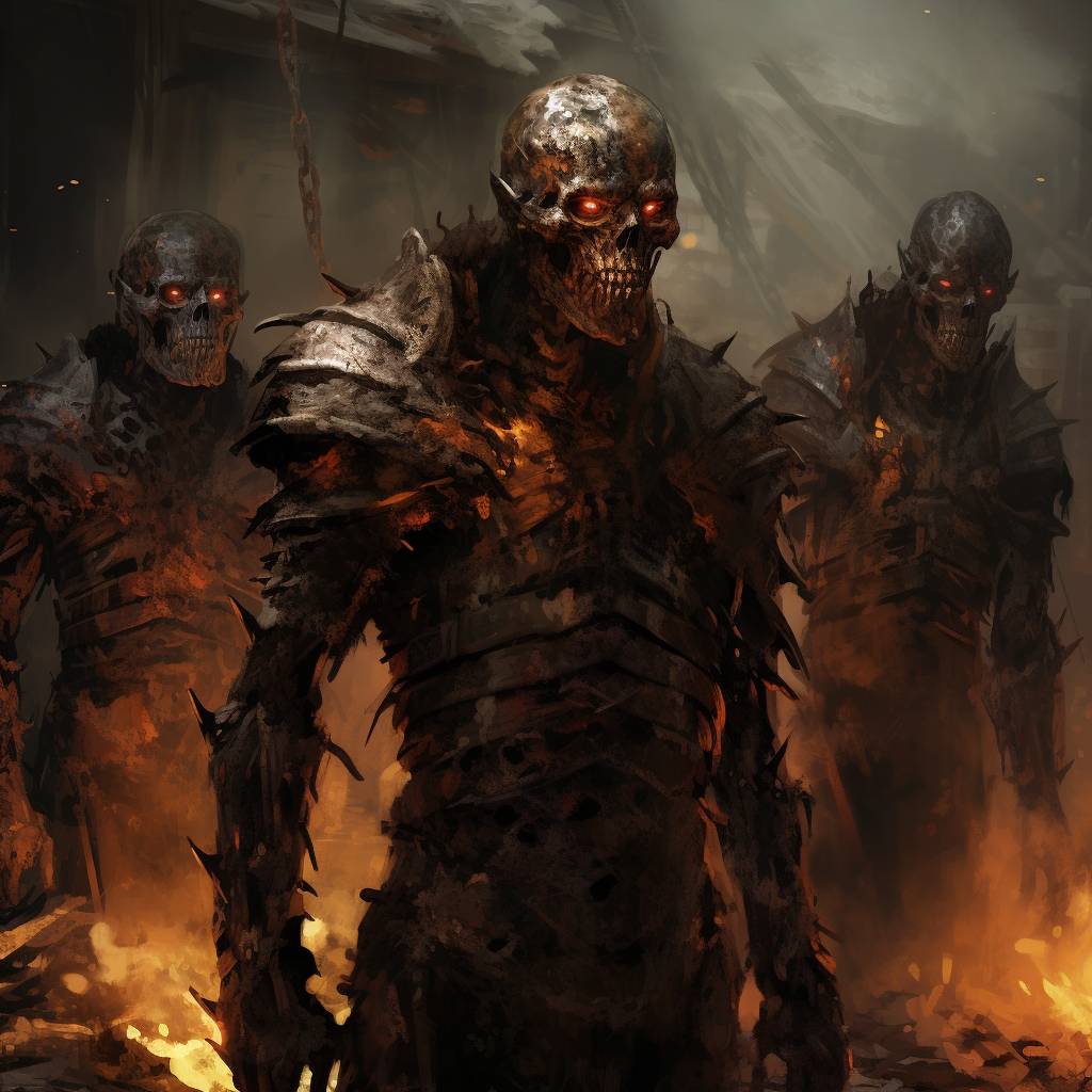 Между тем, Польдаар и его наниматели из отряда Рейме Красного (так звали солдата с повязкой) продвигались к северной границе деревни. Увозя выживших, они и подумать не могли, что наткнутся на настоящее порождение Янну-Корру. Закованный в тяжёлый доспех высокий огненный монстр преградил ворота двуручным мечом и ждал, пока хоть кто-нибудь осмелится бросить ему вызов. Рогатый шлем на его голове явно принадлежал глашатаю тсандерского отряда Монолитников5, стало быть, сей выродок прибыл из далёких земель короля Салливана Рассудительного.