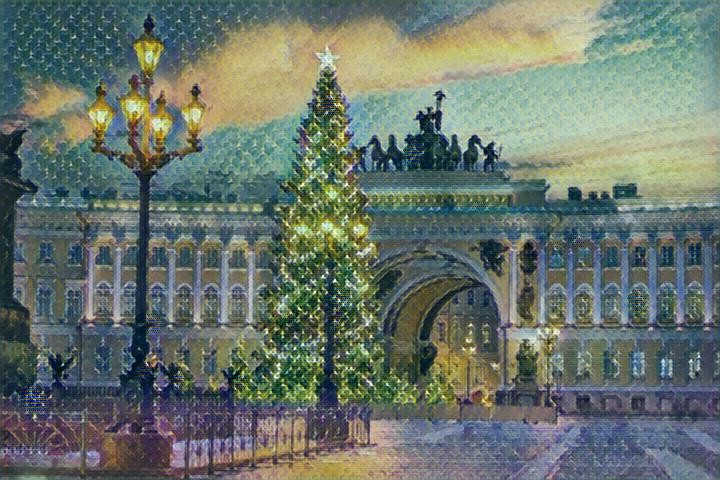 Рождественскую сказку можно не только увидеть, но и услышать. Она поскрипывает полозьями коньков и похрустывает только что выпавшим снежком, шелестит елочной мишурой, звенит колокольчиком и стучит копытцами резвой лошадки, катающей сани на Дворцовой площади. В ней слышны смех и музыка, шипящие искры бенгальских огней и взрывы хлопушек. И уносящийся в небо одинокий голос трубы в арке Генерального штаба.