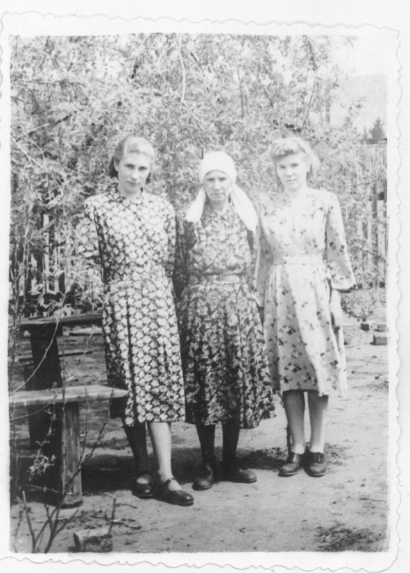 Бабушка Фёкла Петровна Захарова (Воронцова) и дочери Неля и Нина 1955