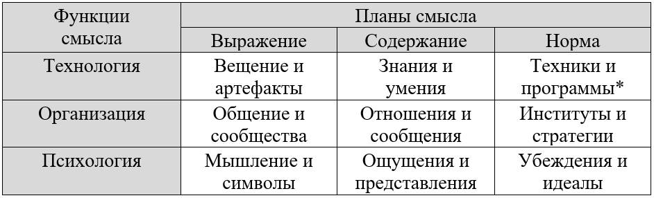 Три функции и три плана смыслов раскрывают строение культуры. Нижеследующая «таблица» демонстрирует узловые точки, в которых сходятся функции и планы смыслов. Мы не даем развернутых пояснений к «таблице», предлагая читателю рассмотреть ее самостоятельно. Следует лишь отметить, что действительное строение культуры, конечно, гораздо менее упорядочено, чем это изображено в «таблице», которая служит только для упрощения и наглядного разъяснения наших тезисов.