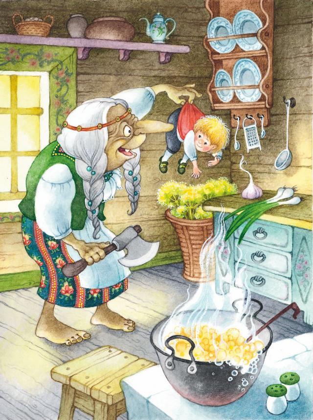 Мальчик залез быстренько в мешок, а хитрая старуха была такова – вскинула добычу на плечи и бросилась из дома вон.