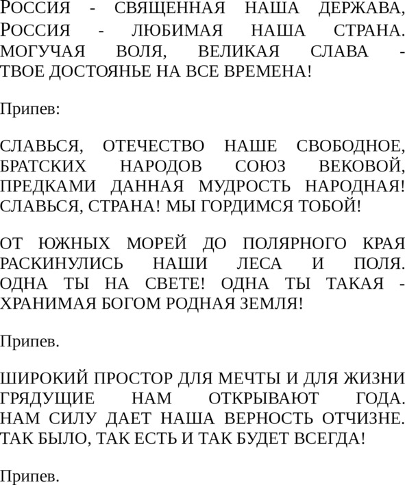 Для этого нужно выбрать достойный текст, текст, который будет возвышать человека, который будет давать очень важные знания о стране, в которой человек живет, о том, какие ценности важны в этой стране. Этот текст должен развивать чувство гордости за свою страну. Поэтому начинать надо с Государственного гимна Российской Федерации (слова С. В. Михалкова).