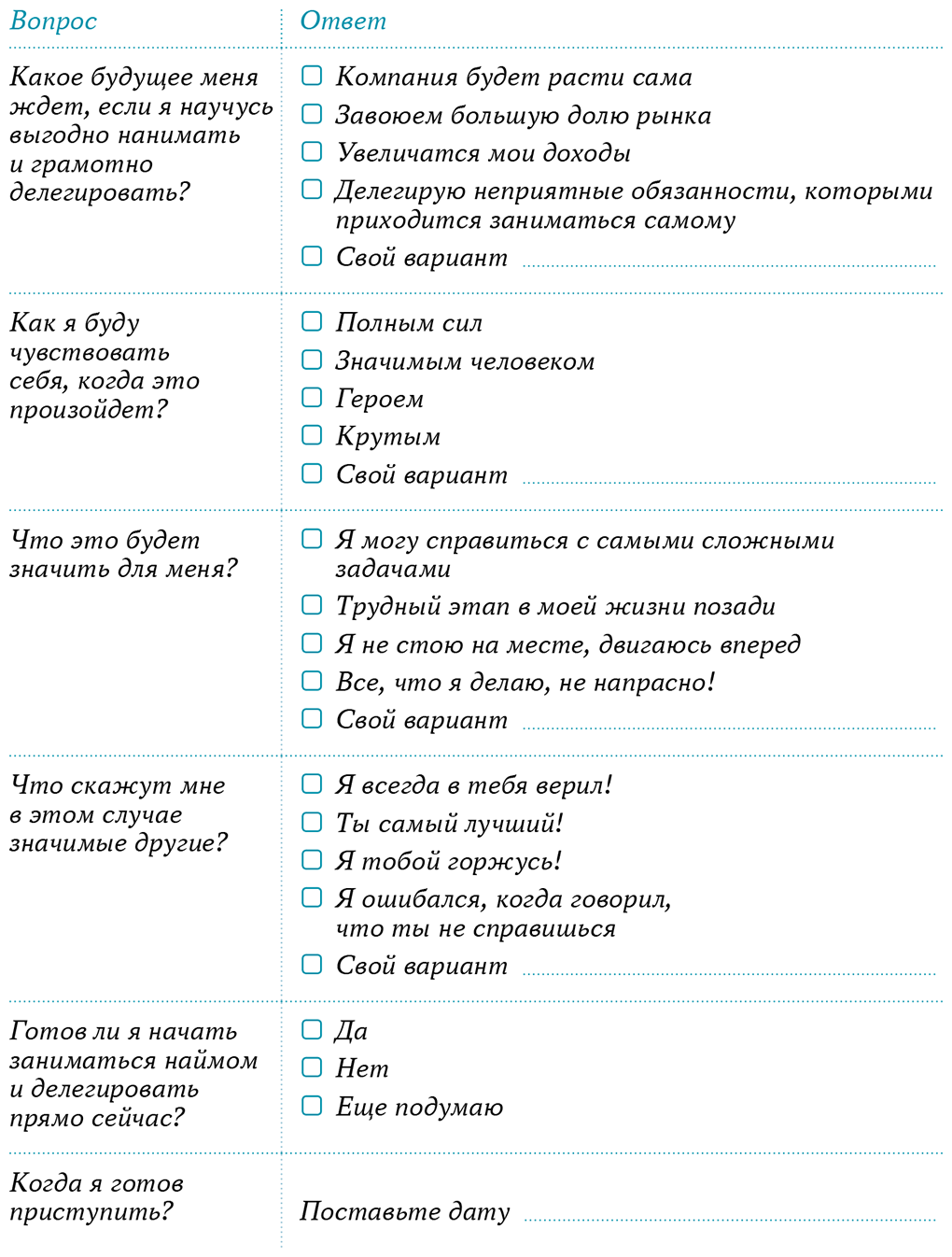 Теперь заполните опросник-мотиватор. Ответьте на вопросы ниже: напротив каждого ответа, с которым согласны, поставьте галочку и напишите свой вариант ответа. На каждый вопрос можно написать дополнительно любое количество ответов. Правильных и неверных ответов нет, они истинны только для вас.