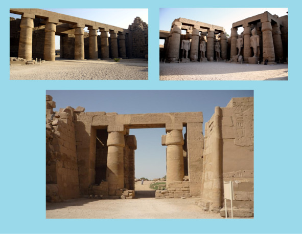 Дальше через узкий проход можно было попасть в открытый двор, обнесенный за ней следовали колонные залы. Затем путь ритуальных процессий завершался в святилище. Кроме главного храма в ансамбли входили другие храмовые сооружения, а также аллеи сфинксов, соединяющие, в частности, храмовые комплексы с Нилом. [8], [35] колоннадой,