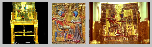 В центре композиции, на спинке трона, помещен традиционный солнечный диск Атона,свободная посадка фигур Тутанхамона и его жены свидетельствует, что художественные традиции Амарнского периода оказались более стойкими, чем религиозные убеждения. С начала захоронений фараонов и других людей гробницы заполнялись многочисленными пластическими изображениями умершего, а также его приближенных и слуг, занятых повседневными делами. В частности, в соответствии с традицией в гробнице Тутанхамона сохранились его изображения, самые значительные из которых – «Тутанхамон в священной ладье», «Тутанхамон на пантере», а также знаменитая . золотая маска Тутанхамона