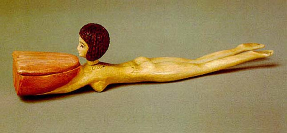 Однако закончить обзор культуры Древнего Египта хочется не огромными застывшими монументальными сооружениями, а грациозными живописными композициями эпохи Нового царства и шедевром мелкой пластики – ложечкой для притираний в виде плывущей женской фигурки.