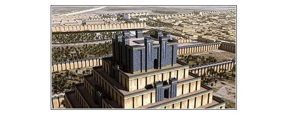 От ворот начинается основная улица города – «дорога процессий» богини , проходящая через весь город, выложенная красным и белым камнемСохранилась надпись на плите, обращение Навуходоносора к верховному богу Мардуку «Я, Навуходоносор, шаррум Вавилона. Я выложил вавилонскую дорогу для процессий… Мардук, владыка! Одари вечной жизнью!» На одном конце города находился огромный царский дворец, а на другом – главное святилище вавилонян – , важнейшим элементом которого являлась храмовая башня – семиэтажный (ступенчатая пирамида) высотой 91 метр, который назывался (храм краеугольного камня небес и земли). Каждый следующий этаж был меньше предыдущего и окрашен в другой цвет. (Сохранилось имя строителя – им был зодчий ). Нижняя ступень – черная, следующая – белая, дальше – фиолетовая, синяя, красная, серебряная. И самая верхняя – золотая. Зиккурат, названный в Библии ,считался в древности одним из чудес света. На вершине башни, куда вела наружная лестница, располагалось святилище верховного бога Мардука, где среди мраморных с золотом и лазурным камнем стен находились золотой стол, ложе бога, а также его почти шестиметровая золотая статуя в длинном, осыпанном звездами одеянии. На голове его светилась золотая тиара. Отсвет покрытого чистым золотом потолка озарял Мардука, словно сияние солнца. Внимание привлекали несоразмерно большие уши. Как известно, по представлениям древних вавилонян, – не мозг, а уши являлись вместилищем разума и духа. Раз в год, в праздник нового лунного года, шаррум покидал свой дворец на золотых носилках с пологом. Затем его можно было увидеть лежащего распростертым перед золотым истуканом, как бы принесенного в жертву Мардуку, а жрецы совершали обряд «воскресения» на новый годичный срок. Судьба стояла над людьми и богами, будущее читали по звездам в священной роще. Семь ярусов Этеменанки символизируют семь главных богов, семь планет, семь дней недели. [14] Иштар . Эсагила зиккурат Этеменанки Арадаххешу «Вавилонской башней»