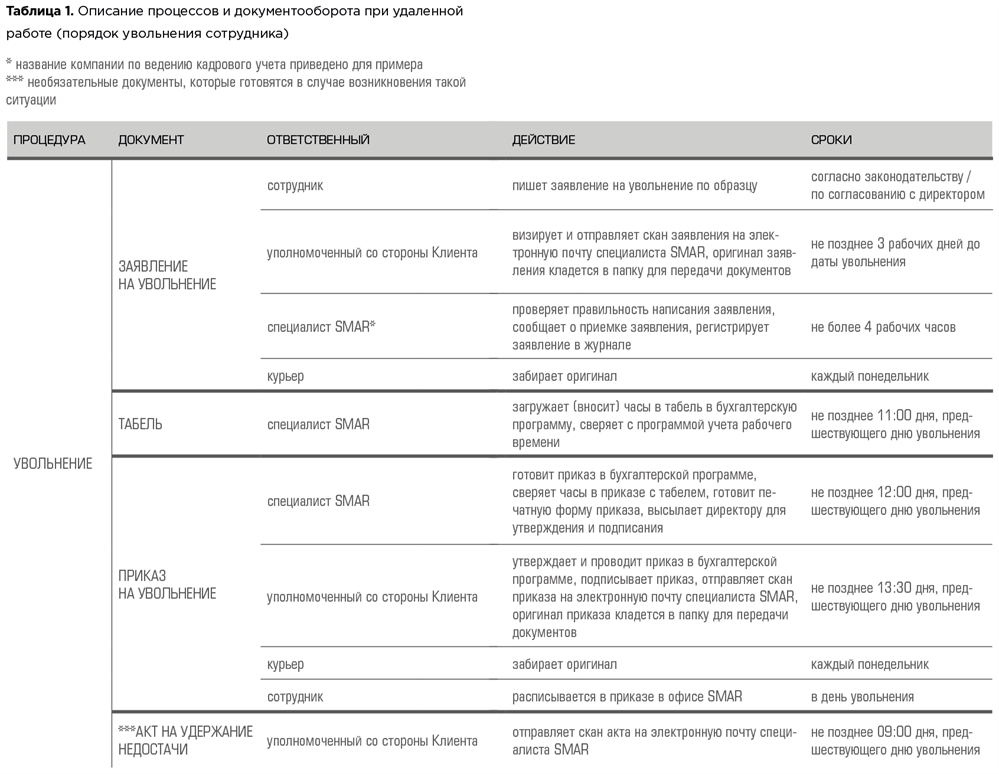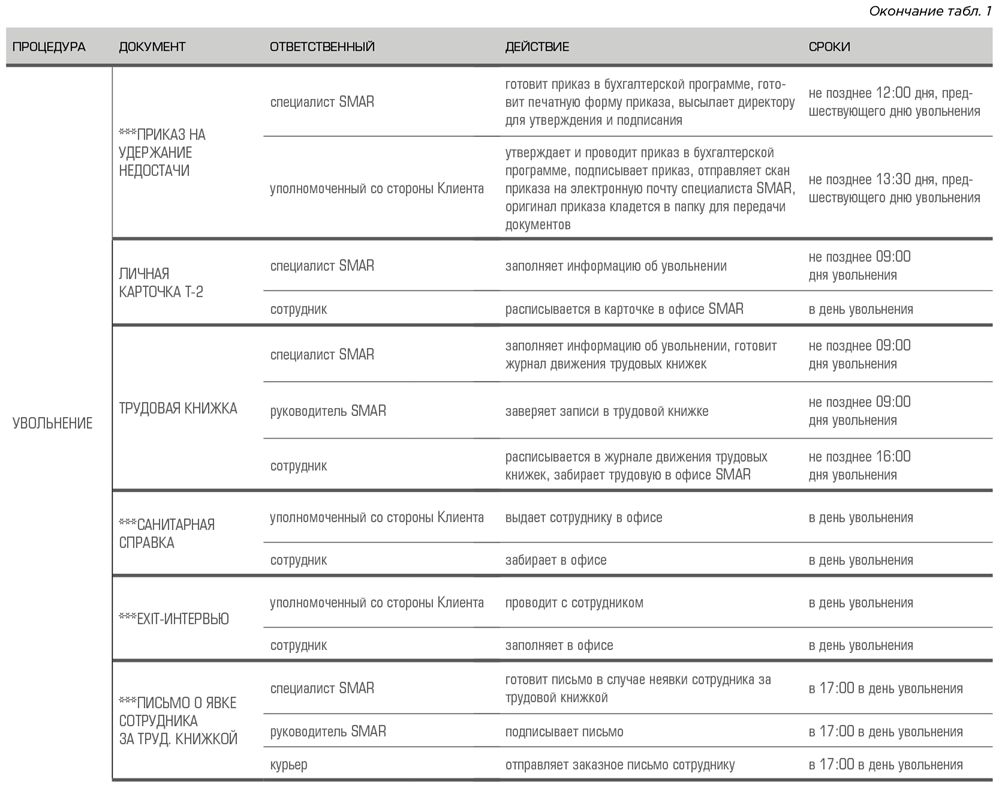 В таблице 1 показано, как выглядит процесс увольнения сотрудника при ведении кадрового учета аутсорсинговой компанией. Как можно видеть, в процессе четко описаны требуемые документы, указаны сроки, в которые они должны быть предоставлены, и перечислены ответственные за это лица.