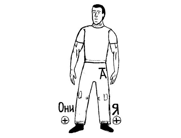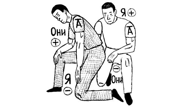 Двумя «ногами», на которые опирается психологическое равновесие человека являются: 1) самооценка и отношение к самому себе; 2) оценка окружающих (-щего) и отношение к ним (к нему) (рис 1). В устойчивом положении «стоя на обеих ногах» (а) человек находится в позиции Я+Они+. При появлении отрицательного отношения к окружающим или к себе (Я+Они-, Я-Они+), человек теряет устойчивое психологическое равновесие, ведь ему в этих случаях приходится опираться только на одну «психическую ногу» (б). Отрицательное же отношение к себе и к окружающим (Я-Они-) полностью лишает человека психологической опоры, вынуждая упасть (в). Лишенный устойчивого положения человек становится слабым и уязвимым для психологических ударов агрессора и другим негативным воздействиям извне. Позитивный образ себя и окружающих играет большую роль во взаимодействии человека с окружающими. В начале жизни все люди придерживаются позиции Я+Они+, непредвзято глядя на себя и окружающие явления. Находясь в это время в позитивном окружении и при удовлетворении своих нужд, повзрослев, человек сохраняет данную позитивную жизненную позицию в качестве основной. Он смотрит на мир позитивно, верит в себя и других людей, стремится к саморазвитию, открыт идеям окружающих и готов экспериментировать. Такой человек умеет признавать как свои, так и чужие ошибки, позволяет себе свободно выражать любые чувства и эмоции, не изменяя при этом своим позитивным взглядам и установкам. В позиции + + человек воспринимает себя победителем в окружении других победителей и проявляет уважение к себе и окружающим.