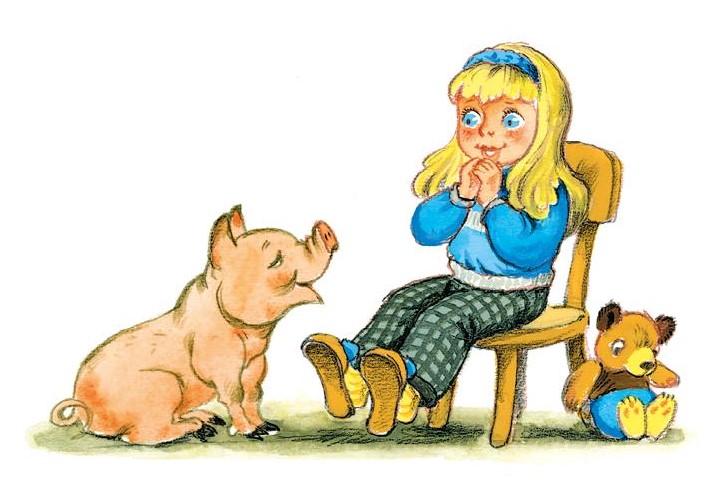 Один раз я видел, как одна совсем маленькая девочка учила поросёнка говорить. Поросёнок ей попался очень умный и послушный, но почему-то говорить по-человечески он ни за что не хотел. И девочка как ни старалась – ничего у неё не выходило.