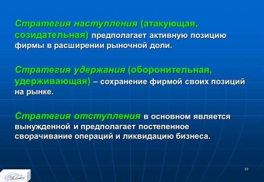 2. программа маркетинговой деятельности предприятия, связанная с процессом выработки способов и методов достижения целей, определение необходимых средств и направлений действий, исходя из глобальных идей маркетинга;
