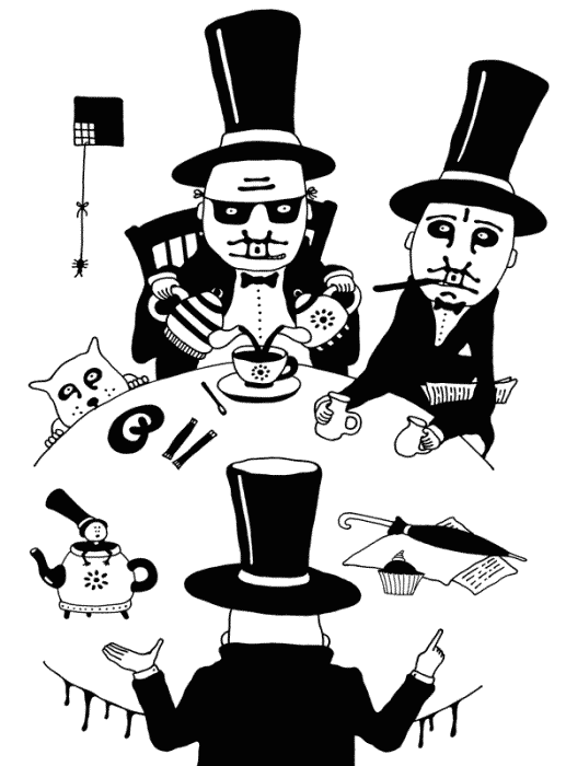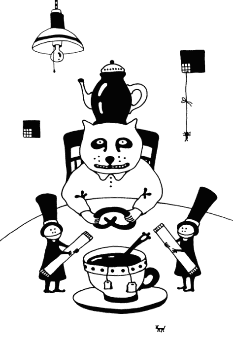 – Ну что ж, господа, – сказал Кот Томас, посовещавшись с Кренделем, – мы с моим здравомыслящим другом оставляем вас блюсти традиции в компании этой очаровательной таблички, а сами отправляемся пить конкурирующий чай с конкурирующими сливками!