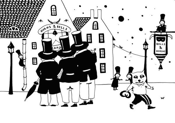 Пять минут спустя Кот Томас и Крендель сидели за столиком у камина в «Бубенцах и рогах» и наблюдали в окно, как их закадычные друзья, стремительно набухая под дождем, из последних сил блюдут традиции у порога «Рогов и бубенцов».