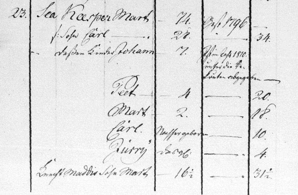 По данным 6-ой ревизии (1810-1811 год). Mart SeaKasper умер в 1796 году. Его сыну Карлу 44 года (ошибочно написано 34). Дети Карла: Юган умер в 1810 году, Питу 20 лет, Марту 18 лет, впервые упоминается 10-летний внук Карл (наш предок) и 4-летний Юрий. (Копия документа из архива Эстонии)