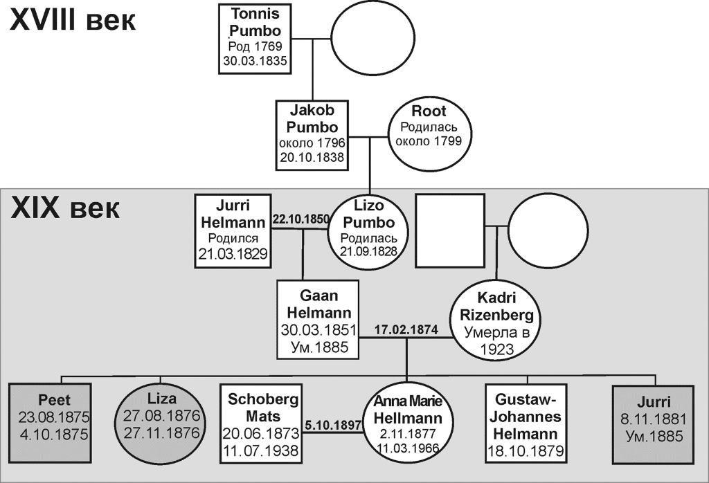 С эстонскими корнями бабушки Анны-Марии Гельман проще (смотрим её генеалогическое древо). Её отец Ян Гельман был сыном Юрия Гельмана /Jurri Helmann/, родившегося 21 марта 1829 и 22 октября 1850 обвенчавшегося c Лизой Пумбо /Lizo Pumbo/ (рождена 21 сентября 1828). Больше о самом Юрии Гельмане ничего не известно. Но вот его жена Лизо Пумбо была внучкой Тонниса Пумбо /Tonnis Pumbo/ (род. около 1769 г.р., умер 30.03.1835) и дочерью Якоба Пумбо /Jakob Pumbo/ (родился около 1796 – умер 20.10.1838). Женой Якоба Пумбо была Рут /Root/ (около 1799 г.р.). У Якоба и Рут было пятеро детей: первый сын, затем четыре девочки. Лизо Пумбо – вторая из этих девочек.