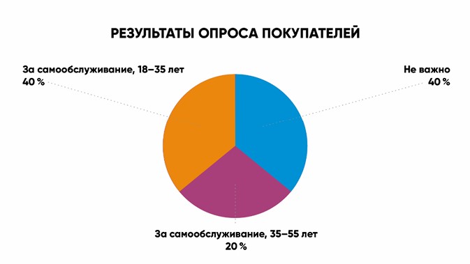 Исследование особенностей потребительского поведения россиян[3] показало, что 60 % опрошенных предпочитают формат самообслуживания. Причем 1/3 из этого числа – респонденты в возрасте от 35 до 55 лет и 2/3 – респонденты в возрасте от 18 до 35 лет, что повышает в будущем потенциал развития ритейла в направлении самообслуживания.