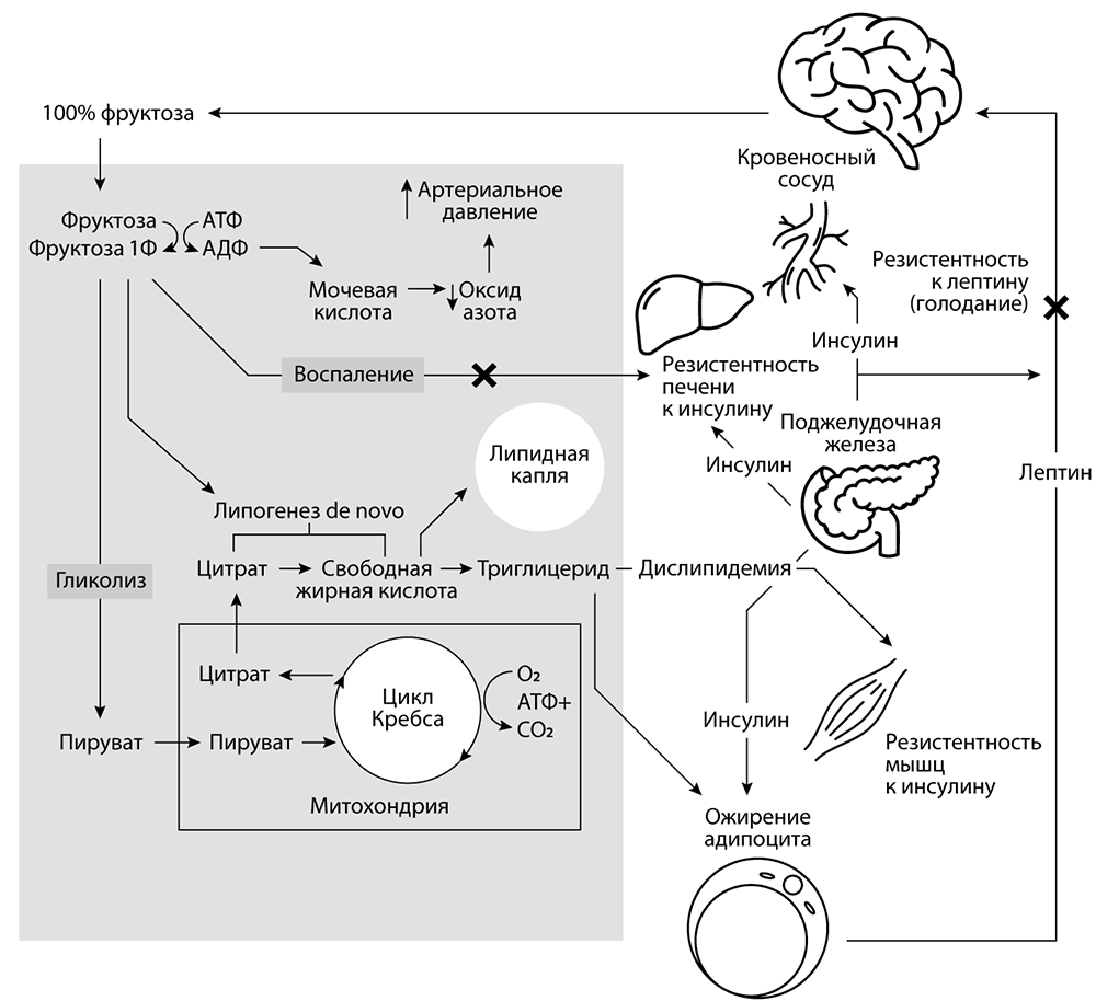 Рисунок 2–1: б) Путь метаболизма фруктозы в печени. 100 % фруктозы поступает в печень. Фруктоза приводит к потере фосфатов из АТФ, образованию мочевой кислоты, которая уменьшает количество оксида азота, расслабляющего кровеносные сосуды, а это приводит к гипертонии. Бо́льшая часть фруктозы превращается в пируват, митохондрии перегружаются, а избыток переходит в жир в печени, что вызывает резистентность к инсулину. Высокий уровень инсулина препятствует насыщению, стимулируя дальнейшее потребление пищи.