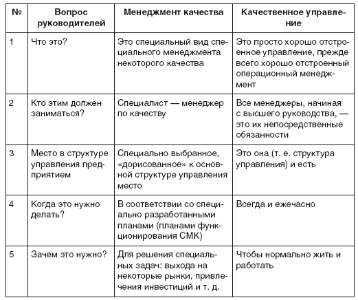 Понятие quality management переведено на русский как «менеджмент качества», а не как «качественное управление». Это приводит к путанице среди руководителей высшего и среднего звена в отношении всей совокупности вопросов, касающихся этого понятия (табл. 1.1).