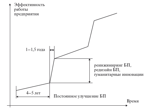 Для развития и повышения своей эффективности организации приходится постоянно совершенствоваться, внедряя технические, организационные и гуманитарные инновации (рис. 1.2). При этом периоды регулярного совершенствования существующих процессов организации (продолжительностью 4–5 лет) должны сменяться периодами перестройки организации, когда коренным образом меняется технология выполнения процессов (перепроектирование бизнес-процессов, или редизайн БП), или даже сама сеть процессов (реинжениринг бизнес-процессов, БПР).