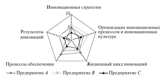 Понятно, что задачи интересны самому предприятию, а партнерам и инвесторам интересны решения этих задач. Для того чтобы продемонстрировать правильность и эффективность управления инновационным процессом, еврокомиссией предложена методология IMP3rove для оценки инновационного уровня предприятий, консалтинга с целью повышения этого уровня и т. д. На рис. 1.5 приведены диаграммы оценки инновационного уровня для трех европейских предприятий. Инновационный уровень оценивается по пяти компонентам, каждый компонент – по 2–5 частным критериям. Основные компоненты: