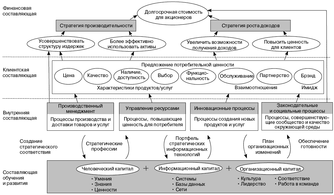 Человеческий капитал ассоциируется со знаниями, умениями и навыками сотрудников, позволяющими им воплотить стратегию компании в жизнь. Информационный капитал связан с информационными технологиями (программными продуктами и технологической инфраструктурой). Организационный капитал охватывает корпоративную культуру, лидерство, совпадение личных и корпоративных целей, умение работать в команде.