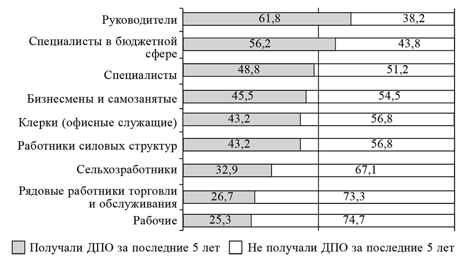Наиболее часто за последние пять лет совершенствовали свое образование руководители и профессионалы (50 % и более), причем специалисты в бюджетной сфере (например, врачи и педагоги) делали это на 7 % чаще, чем остальные специалисты. Такая разница между специалистами бюджетной и небюджетной сфер объясняется тем, что первые в отличие от вторых обязаны периодически подтверждать свою квалификацию и проходить обучение (например, врачи раз в пять лет проходят сертификацию, включающую обучение). Сравнительно реже получали дополнительное образование бизнесмены и самозанятые, хотя и среди них соответствующий показатель превышал 45 %. Чуть более 40 % работников силовых структур (военнослужащие, работники правоохранительных органов) и рядовых офисных сотрудников также проходили дополнительное обучение в течение предыдущих пяти лет. В наименьшей степени были включены в этот процесс рабочие, среди которых рассматриваемый показатель составляет только 25,3 %.