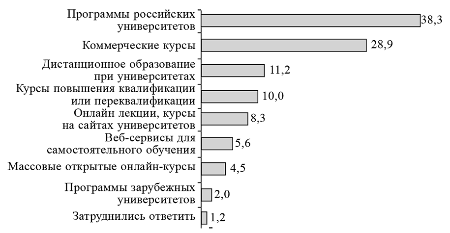 Качество ДПО во многом зависит от того, какую именно его форму выбрал тот или иной человек. Как показано на рис. 5, наиболее часто за предыдущие пять лет работающие россияне, повышающие свой уровень образования, выбирали программы государственных университетов (38,3 %) и коммерческие курсы (28,9 %). Дистанционные формы обучения выбирали лишь 11,2 % рассматриваемого контингента. Еще меньше было тех, кто проходил курсы повышения квалификации или переподготовки от предприятия или государственных социальных служб (например, центров службы занятости). Все остальные формы дополнительного образования, включая самостоятельное обучение и программы зарубежных курсов, использовались россиянами в последние годы гораздо реже.