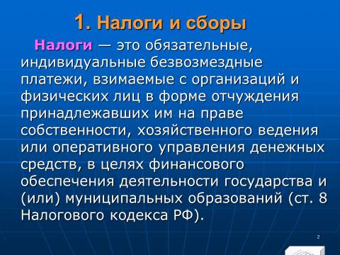 1. обязательные, индивидуальные безвозмездные взносы, взимаемые с организаций и физических лиц в форме отчуждения принадлежавших им на праве собственности, хозяйственного ведения или оперативного управления денежных средств, в целях финансового обеспечения деятельности государства и (или) муниципальных образований (ст. 7 Конституции РФ)