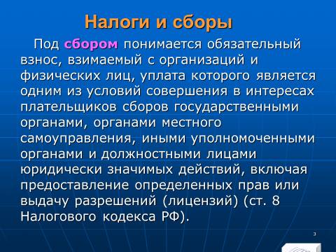 1. обязательный взнос, взимаемый с организаций и физических лиц, уплата которого является одним из условий совершения в интересах плательщиков сборов государственными органами, органами местного самоуправления, иными уполномоченными органами и должностными лицами юридически значимых действий, включая предоставление определенных прав или выдачу разрешений (лицензий) (ст. 8 Налогового кодекса РФ)