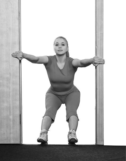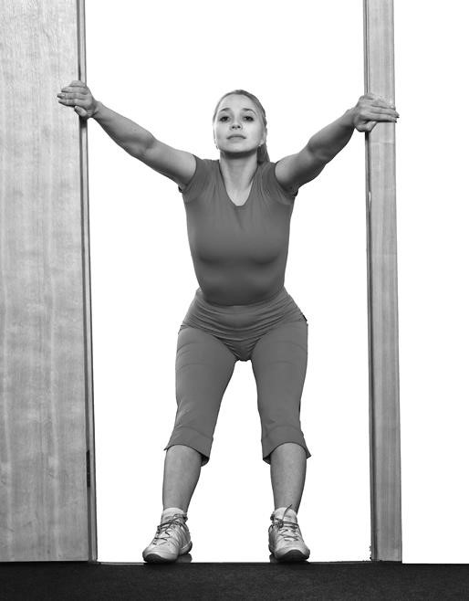 Ноги упираются в пол. Можно выполнять упражнение босиком, если пол паркетный. (Внимание: ковров или дорожек на полу быть не должно!) Медленно (на выдохе!) отводить таз назад, руками при этом держаться за косяки. В конечной точке постоять 3–5 секунд до ощущения болезненного растяжения мышц задней поверхности ног и всей спины, затем так же медленно (опять на выдохе – вдох происходит автоматически между выдохами) вернуться в И.П. (держась руками за косяки, ноги прямые, центр тяжести тела на руках!).