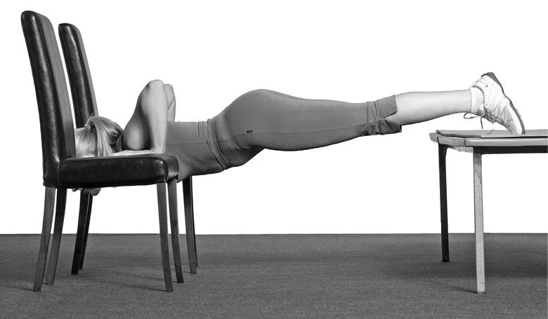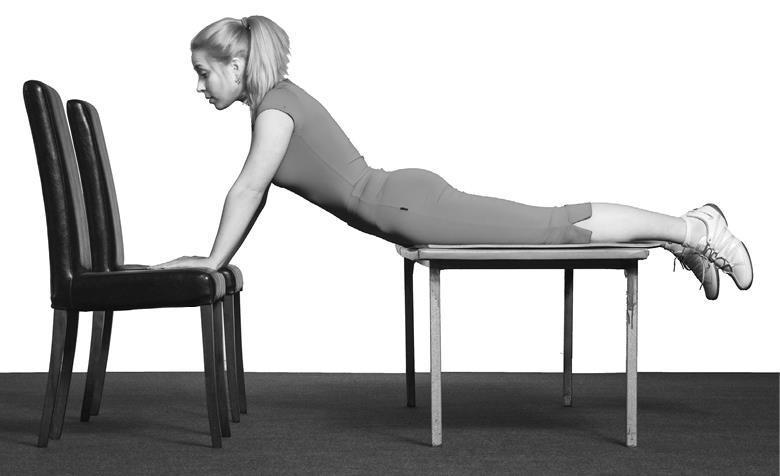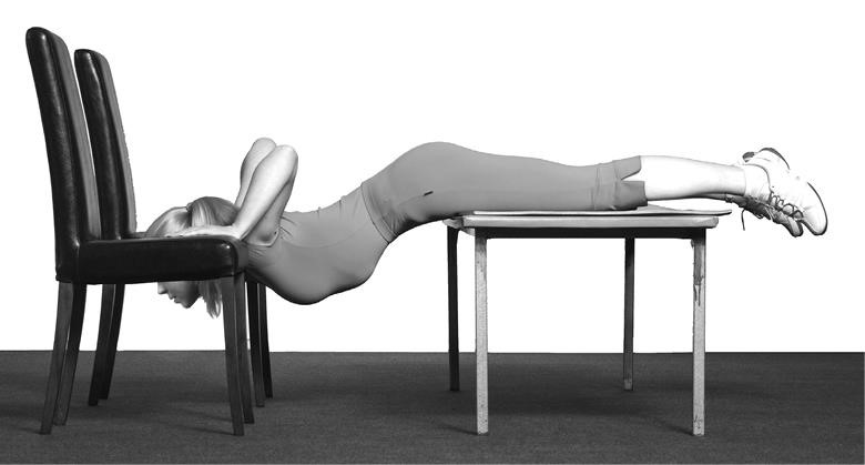 Рецепт № 4 «Глубокие отжимания»Около кровати на расстоянии вытянутой руки стоят два стула на ширине плеч или чуть шире. Ноги полностью (до таза) лежат на кровати, руки упираются в сиденья стульев, локти согнуты (см. фото 4 а, б). Медленно (на выдохе) отжаться от сидений стульев (полностью выпрямить руки), выгибая спину колесом. Для этого руки должны упираться в сиденье стульев строго перпендикулярно их поверхности. Сделайте небольшой вдох. Затем медленно опустите верхнюю часть туловища (грудной отдел позвоночника) между стульев (максимально) на выдохе. При этом лопатки должны сойтись. Надо приучить плечевые суставы и мышцы грудного отдела к растяжке. Сложность этого упражнения заключается в том, что с каждым разом стулья все дальше отодвигают от кровати до тех пор, пока упор ног будет осуществляться только стопой (см. фото 4 в, г).