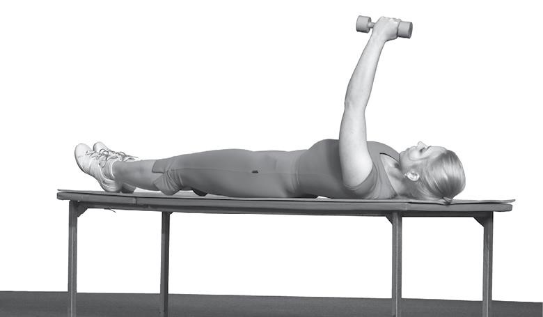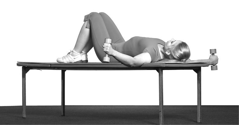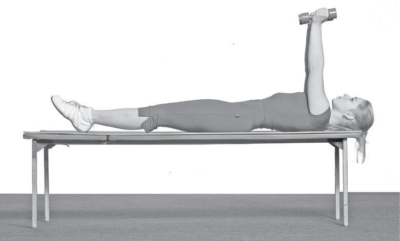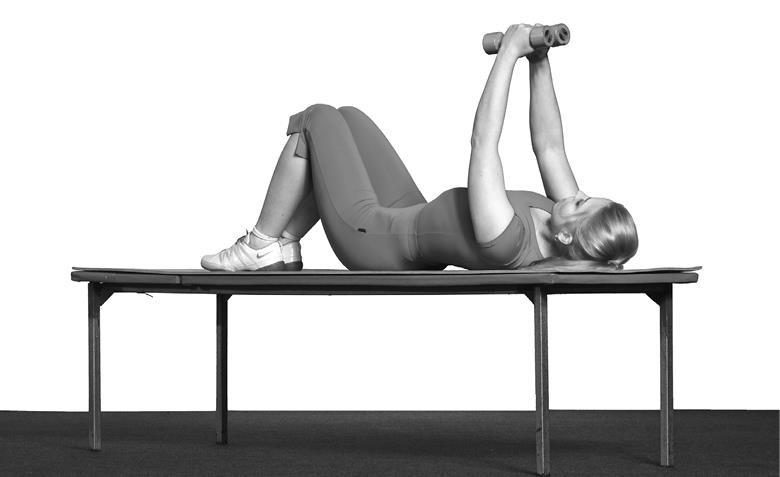 Рецепт № 5 «Пулл-овер»И.П.: лежа поперек кровати так, чтобы голова находилась на самом краю. Ноги либо выпрямлены, либо согнуты в коленях. Руки подняты вверх, перпендикулярно поверхности кровати (см. фото 5 а, б). В руках гантели (от 2 до 8 кг) или любой другой тяжелый предмет (например, грелка, наполненная водой). Медленно опускать руки за голову (на выдохе), стараясь опустить их ниже головы. При этом максимально растягивается грудной отдел позвоночника. И так же медленно на выдохе поднимать руки в исходное положение. Вдох происходит между этими двумя движениями. Вес отягощений можно постепенно увеличивать. Сложность упражнения может быть усилена за счет увеличения веса гантелей. Количество повторений в одной серии от 10 до 15.